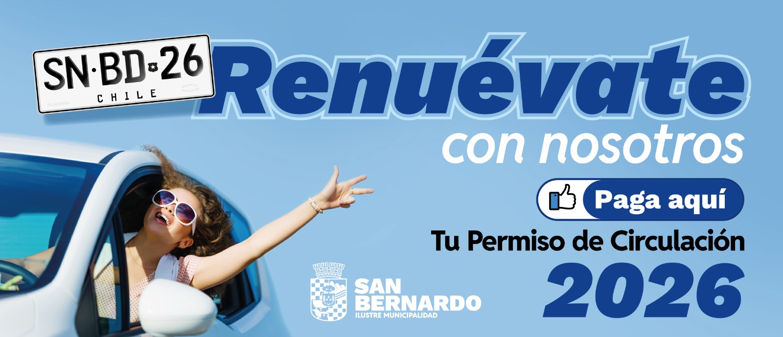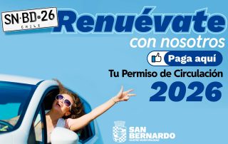 La Municipalidad de San Bernardo informa a todos los vecinos y vecinas que el proceso para obtener el Permiso de Circulación 2026 ya ha comenzado. Le informamos que el sistema de pago online ya se encuentra plenamente habilitado, permitiéndole realizar el trámite de forma anticipada y desde la comodidad de su hogar a través del sitio web municipal. Requisitos y Documentaci...[continuar]