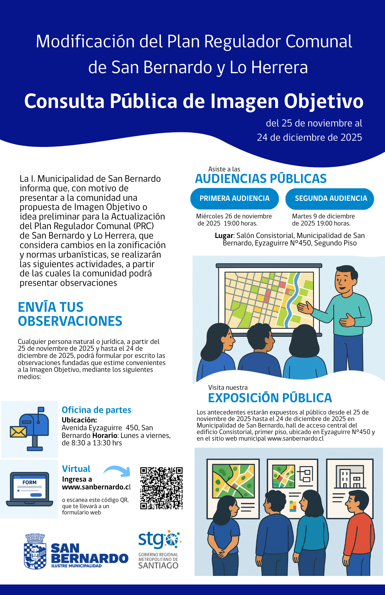 La Municipalidad de San Bernardo informa a la comunidad el inicio de la consulta pública de Imagen Objetivo, una etapa clave en la actualización del Plan Regulador Comunal (PRC) de San Bernardo y Lo Herrera.