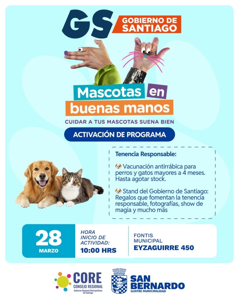 Una de las principales iniciativas es la jornada “Mascotas en buenas manos”, que se realizará el 28 de marzo desde las 10:00 horas en la Frontis Municipal, en Eyzaguirre 450. En esta actividad se ofrecerá vacunación antirrábica gratuita para perros y gatos mayores de cuatro meses, hasta agotar stock, además de espacios informativos y actividades para promover la tenencia responsable.